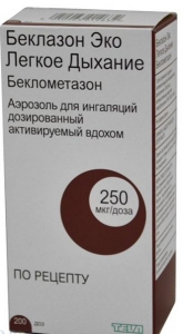 Фармакологическое действие ГКС для ингаляционного применения. Препарат для базисной терапии бронхиальной астмы. Оказывает выраженное противовоспалительное, противоаллергическое и антиэкссудативное действие. Под действием препарата снижается количество тучных клеток в слизистых оболочках бронхов, уменьшается отек эпителия, секреция слизи бронхиальными железами, гиперреактивность бронхов и улучшаются показатели функции внешнего дыхания. Предотвращает возникновение приступов бронхиальной астмы. Не обладает минералокортикоидной активностью. Препарат не оказывает купирующего действия на бронхоспазм. Терапевтический эффект развивается постепенно, обычно через 5-7 дней курсового применения препарата. Важно применять препарат регулярно, даже когда симптомы бронхиальной астмы отсутствуют и не прекращать применение без рекомендации врача. При применении в рекомендуемых дозах препарат практически не оказывает системного действия.Фармакокинетика Фармакокинетика беклазона дипропионата изучена недостаточно. При ингаляционном введении 10-20% дозы поступает в легкие, где происходит гидролиз беклометазона дипропионата с образованием активного метаболита - беклометазона монопропионата. Большая часть беклометазона дипропионата, проглоченного при ингаляции, инактивируется при "первом прохождении" через печень. Связывание с белками плазмы составляет 87% от количества активного вещества, находящегося в системном кровотоке.Выведение Основная часть активного вещества (35-76%) выводится в течение 96 ч с калом, преимущественно в виде полярных метаболитов.Показания – профилактика обострений бронхиальной астмы и ее лечение при неэффективности терапии бронходилататорами; – неэффективность терапии кромогликатом натрия в сочетании с бронходилататорами; – гормонозависимая бронхиальная астма тяжелого течения.Противопоказания – тяжелые приступы бронхиальной астмы, требующие интенсивной терапии; – туберкулез; – I триместр беременности; – детский возраст до 4 лет; – повышенная чувствительность к компонентам препарата.Побочное действие Ингалятор Беклазон ЭКО в рекомендованных дозах не вызывает побочных эффектов, характерных для системных ГКС. Со стороны дыхательной системы: возможны охриплость голоса, ощущение раздражения или першения в горле, (чтобы избежать этих явлений необходимо полоскать рот водой после каждой ингаляции); редко - чиханье, кашель; в отдельных случаях - парадоксальный бронхоспазм (легко купирующийся применением бронходилататоров). При длительном применении препарата, особенно в высоких дозах (более 400 мкг/сут), возможен кандидоз полости рта и верхних отделов дыхательных путей (проходящий при местной противогрибковой терапии без прекращения лечения Беклазоном ЭКО ). Прочие: при длительном применении препарата в дозах более 1.5 мг/сут возможно развитие скрытой надпочечниковой недостаточности. При замене приема ГКС в форме таблеток на ингаляционные возможно появление кожной сыпи.Беременность и лактация Препарат противопоказан к применению в I триместре беременности. Клинических данных о безопасности применения препарата при беременности недостаточно. Данные о выделении беклометазона дипропионата с грудным молоком у человека отсутствуют. При беременности и в период лактации следует с осторожн