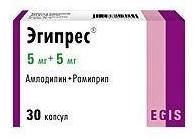 После приема рамиприла внутрь время достижения Cmax рамиприла и рамиприлата составляет через 1 и 2–4 ч соответственно. Снижение концентрации рамиприлата в плазме крови происходит в несколько этапов: фаза распределения и выведения с T1/2 рамиприлата, составляющим приблизительно 3 ч, затем — промежуточная фаза с T1/2 рамиприлата, составляющим приблизительно 15 ч, и конечная фаза с очень низкой концентрацией рамиприлата в плазме крови и T1/2 рамиприлата, составляющим приблизительно 4–5 дней. Эта конечная фаза обусловлена медленным высвобождением рамиприлата из прочной связи с рецепторами АПФ. Несмотря на продолжительную конечную фазу при однократном в течение суток приеме рамиприла внутрь в дозе 2,5 мг и более, Css рамиприлата достигается приблизительно через 4 дня лечения. При курсовом назначении препарата эффективный T1/2 (в зависимости от дозы) составляет 13–17 ч. Связывание с белками плазмы крови приблизительно составляет для рамиприла 73%, а для рамиприлата — 56%. После в/в введения Vd рамиприла и рамиприлата составляют приблизительно 90 и 500 л соответственно. После приема внутрь меченного радиоактивным изотопом рамиприла (10 мг), 39% радиоактивности выводится через кишечник и около 60% — почками. После в/в введения рамиприла, 50–60% дозы обнаруживается в моче в виде рамиприла и его метаболитов. После в/в введения рамиприлата — около 70% дозы обнаруживается в моче в виде рамиприлата и его метаболитов, иначе говоря, при в/в введении рамиприла и рамиприлата значительная часть дозы выводится через кишечник с желчью, минуя почки (50 и 30% соответственно). После приема внутрь 5 мг рамиприла у пациентов с дренированием желчных протоков практически одинаковые количества рамиприла и его метаболитов выделяются почками и через кишечник в течение первых 24 ч после приема. Приблизительно 80–90% метаболитов в моче и желчи были идентифицированы как рамиприлат и метаболиты рамиприлата. Рамиприла глюкуронид и рамиприла дикетопиперазин составляют приблизительно 10–20% от общего количества, а содержание в моче неметаболизированного рамиприла составляет приблизительно 2%. При нарушениях функции почек с Cl креатинина менее 60 мл/мин выведение рамиприлата и его метаболитов почками замедляется. Это приводит к повышению концентрации рамиприлата в плазме крови, которая снижается медленнее, чем у пациентов с нормальной функцией почек. При приеме рамиприла в высоких дозах (10 мг) нарушение функции печени приводит к замедлению пресистемного метаболизма рамиприла до активного рамиприлата и более медленному выведению рамиприлата. У здоровых добровольцев и пациентов с АГ после 2 нед лечения рамиприлом в суточной дозе 5 мг не наблюдается клинически значимое накопление рамиприла и рамиприлата. У пациентов с ХСН после 2 нед лечения рамиприлом в суточной дозе 5 мг отмечается увеличение в 1,5–1,8 раза концентраций рамиприлата в плазме крови и AUC. У здоровых добровольцев пожилого возраста (65–76 лет) фармакокинетика рамиприла и рамиприлата существенно не отличается от таковой у молодых здоровых добровольцев. Показания: Артериальная гипертензия (пациенты, которым показана комбинированная терапия амлодипином и рамиприлом в дозах, как в комбинации). Категория действия на плод: Препарат Эгипрес противопоказан для применения, т.к. рамиприл может оказать неблагоприятное воздействие