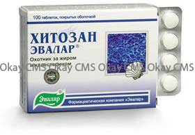 Хитозан Эвалар таблетки «Хитозан Эвалар» — охотник за жиром и холестерином! Причина избыточной массы тела кроется чаще всего в переедании и гиподинамии. Обильный прием пищи, превышающий по энергоемкости наши энергозатраты – это проблема современного общества. Появлению жировых отложений способствует тот жир, который мы получаем с пищей. Стоит преградить жирам путь в организм, как он тут же пускает в ход собственные жировые запасы, что ведет к значительной потере веса и излишков отложений жира. Хитозан, полученный из панцирей крабов природный полисахарид с редкой липотропной адсорбционной (поглощающей) способностью, который да¬рит нам ценную возможность освободить наш организм от лишнего жира. Хитозан связывает жиры, содержащиеся в пище, непосредственно в пищеварительном тракте до их усвоения, что объясняется содержанием в каждом звене полимерной моле¬кулы хитозана положительно заряженных аминогрупп, которые присоединяют множество молекул жира и выводят их из организма. Выведение жиров связаных с хитозаном до их усвоения, способствует: расходу собственных запасов жира как источника энергии и синтезу необходимых организму веществ, участвующих в липидном (жировом) обмене, способствуя снижению массы тела; естественному снижению уровня холестерина в крови, что способствует улучшению функций сердечно-сосудистой системы. Проблема лишнего веса и повышенного уровня холестерина в крови в последнее десятилетие стала актуальной и для людей с 30 лет. Для сохранения здоровья на долгие годы на эту проблему необходимо обращать внимание, и чем раньше, тем лучше. А начинать лучше с натуральных и эффективных средств. Хитозан также оказывает благоприятное влияние на состояние желудочно-кишечного тракта: поддерживает в норме бактериальную микрофлору кишечника; способствует улучшению перистальтики кишечника; адсорбирует и способствует выведению из кишечника токсинов и радионуклидов. Свойства компонентов Хитозан Эвалар: Хитозан – аминополисахарид, полученный из панцирей ракообразных, является натуральным источником особой липофильной формы пищевых волокон. Хитозан зарекомендовал себя как уникальное вещество, связывающее и выводящее из организма жиры, поступающие с пищей, а также как не имеющий аналогов природный продукт, способствующий снижению уровня холестерина в крови. Хитозан в комплексе с витамином С и лимонной кислотой в пищеварительном тракте образует устойчивый гель, действующий как «губка для жира», что предотвращает всасывание жира в кровь. Для поддержания обмена веществ организм переключается на расходование собственных запасов жира и в первую очередь использует «плохой» холестерин и жировые отложения. Хитозан также улучшает усвоение организмом кальция из пищи, снижает избыток концентрации хлоридов, поступающих с пищей, что важно для поддержки нормального артериального давления. Хитозан обладает всеми свойствами пищевых волокон – способствует улучшению перистальтики кишечника и быстрому выведению из организма продуктов обмена, токсических соединений, поступающих в кишечник или образующихся в нем. А также способствует нормализации кишечной микрофлоры и улучшению функций и структуры слизистой оболочки желудочно-кишечного тракта. Также дополнительное поступление пищевых волокон в рацион пита