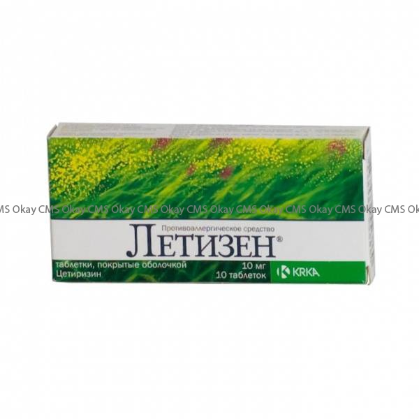 Состав и форма выпуска Таблетки, покрытые пленочной оболочкой: 1 табл. содержит цетиризина дихлорида 10 мг; Прочие ингредиенты: лактоза, кукурузный крахмал, повидон, магния стеарат, титана диоксид, гидроксипропилметилцеллюлоза, макрогол, глицерина триацетат; в контурной ячейковой упаковке 10 шт., в картонной пачке 1 или 2 упаковки. Фармакологическое действие Антигистаминное, противоаллергическое. Селективный блокатор периферических гистаминовых H1-рецепторов. Предотвращает физиологические эффекты гистамина. Помимо антигистаминного действия, обладает противоаллергической активностью. На поздней стадии аллергической реакции он ингибирует выделение гистамина и миграцию эозинофилов. Практически не оказывает антихолинергического и антисеротонинового действия. Действие препарата начинается через 20 мин после приема внутрь, максимальный эффект достигается через 1 ч. Продолжительность действия - 24 ч. Фармакокинетика Всасывание Цетиризин быстро абсорбируется из ЖКТ. Степень абсорбции составляет 70%. Метаболизм и выведение Цетиризин незначительно биотрансформируется в печени, выводится почками, в основном в неизмененном виде. Летизен, показания к применению Профилактика и симптоматическая терапия аллергических заболеваний и реакций, в т.ч.: – круглогодичный и сезонный аллергический ринит; – аллергический конъюнктивит; – хроническая крапивница; – отек Квинке. Режим дозирования Взрослым и детям старше 12 лет назначают в дозе 10 мг (1 таб.) в сутки. Детям в возрасте от 6 до 12 лет с массой тела более 30 кг назначают по 5 мг (1/2 таб.) 2 раза/сут. Детям в возрасте от 6 до 12 лет с массой тела менее 30 кг назначают по 5 мг (1/2 таб.) 1 раз/сут. Больным с умеренной почечной недостаточностью (КК 11-13 мл/мин), пациентам, находящимся на диализе (КК<7 мл/мин) и пациентам с нарушениями функции печени назначают препарат в дозе 5 мг/сут (1/2 таб.). Пожилым пациентам в некоторых случаях требуется коррекция режима дозирования, в связи с замедлением выведения цетиризина из организма. Продолжительность лечения определяют индивидуально. Летизен принимают независимо от приема пищи, запивая небольшим количеством жидкости. Препарат следует принимать в одно и то же время дня. Пациентам, у которых на фоне применения препарата возникает сонливость, рекомендуют принимать его вечером. При пропуске приема очередной дозы препарата необходимо принять пропущенную дозу как можно быстрее. Если приближается время следующего приема препарата, следует пропустить прием забытой дозы и принять вовремя очередную дозу. Побочное действие Со стороны пищеварительной системы: сухость во рту; возможны тошнота, рвота, боль в эпигастрии, диарея, запор, увеличение аппетита, преходящее увеличение активности печеночных трансаминаз (менее, чем у 1.5% пациентов). Со стороны ЦНС: сонливость, чувство усталости, головокружение, головная боль; возможна слабость. Со стороны системы кроветворения: возможны гемолитическая анемия, тромбоцитопения. Препарат в целом хорошо переносится. Побочные эффекты возникают редко и обычно имеют слабо выраженный и преходящий характер. Противопоказания Повышенная чувствительность к компонентам препарата и к гидроксизину. Беременность и лактация При необходимости применения Летизена при беременности следует соотнести предполагаемую пользу для матери и потенциаль